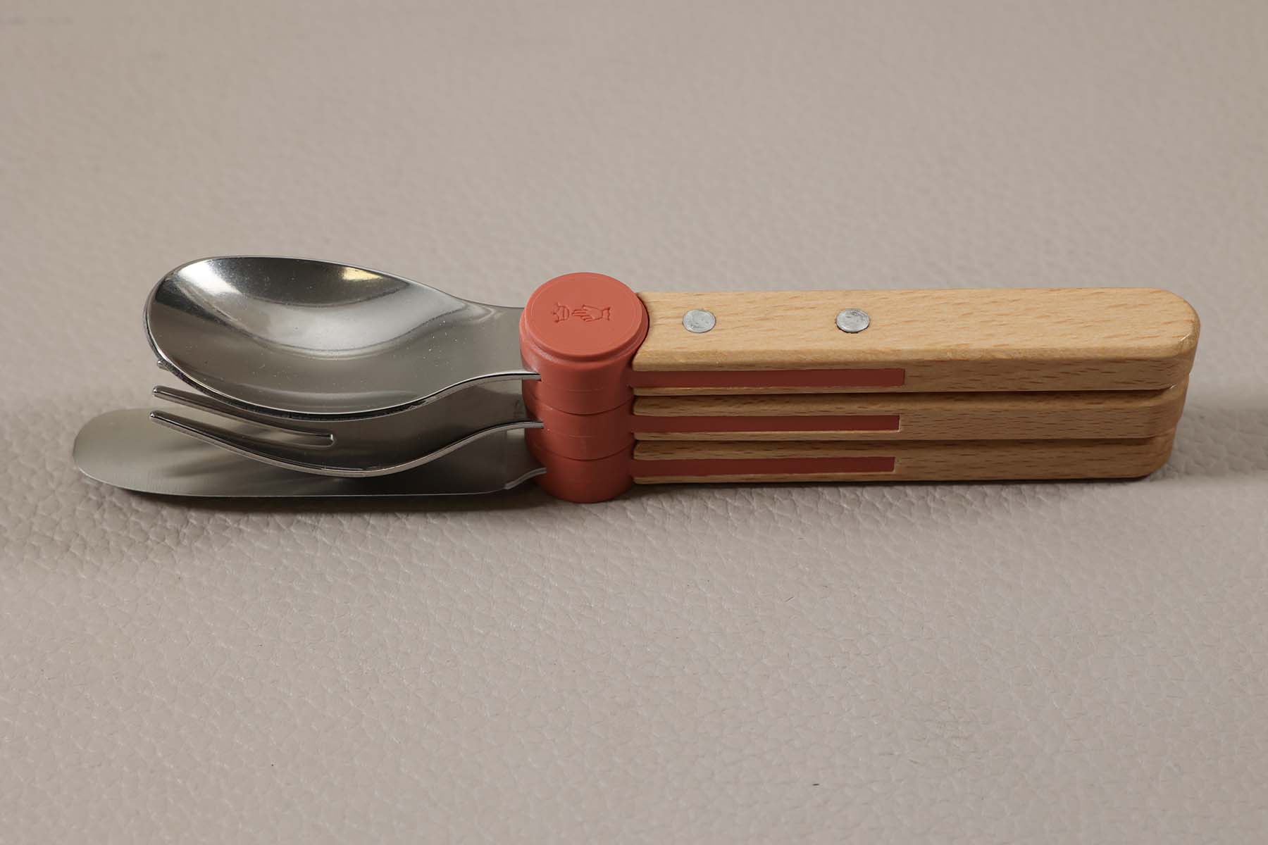 Un clip magnétique corail, permet d'assembler les trois couverts et de les transporter facilement.