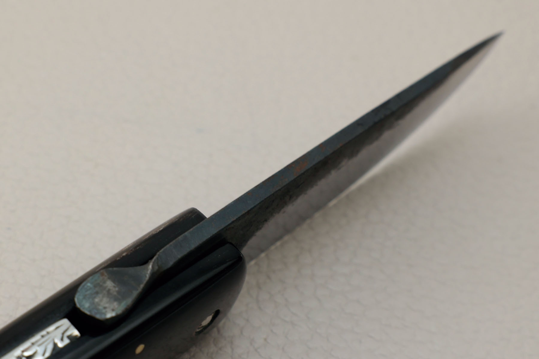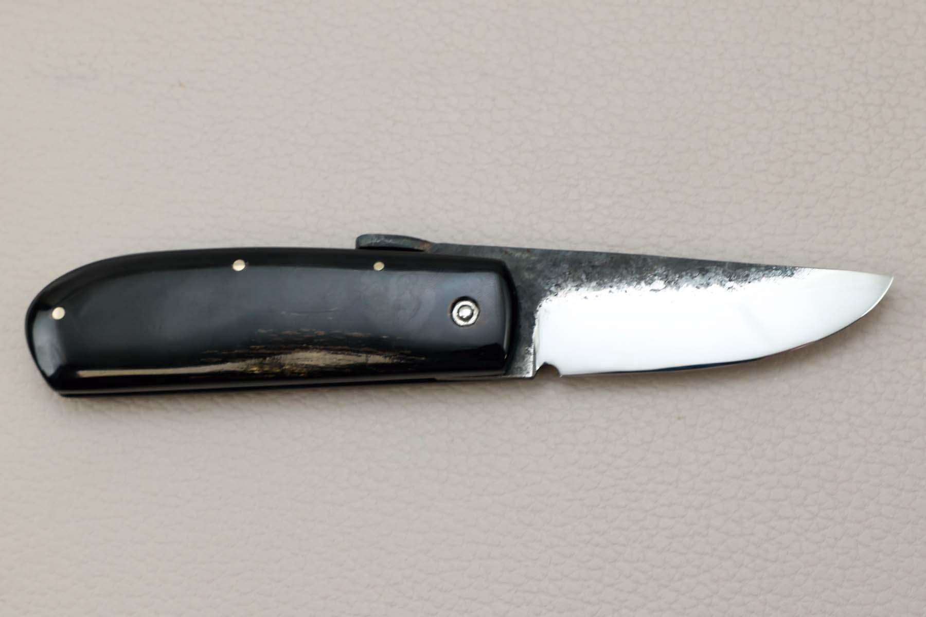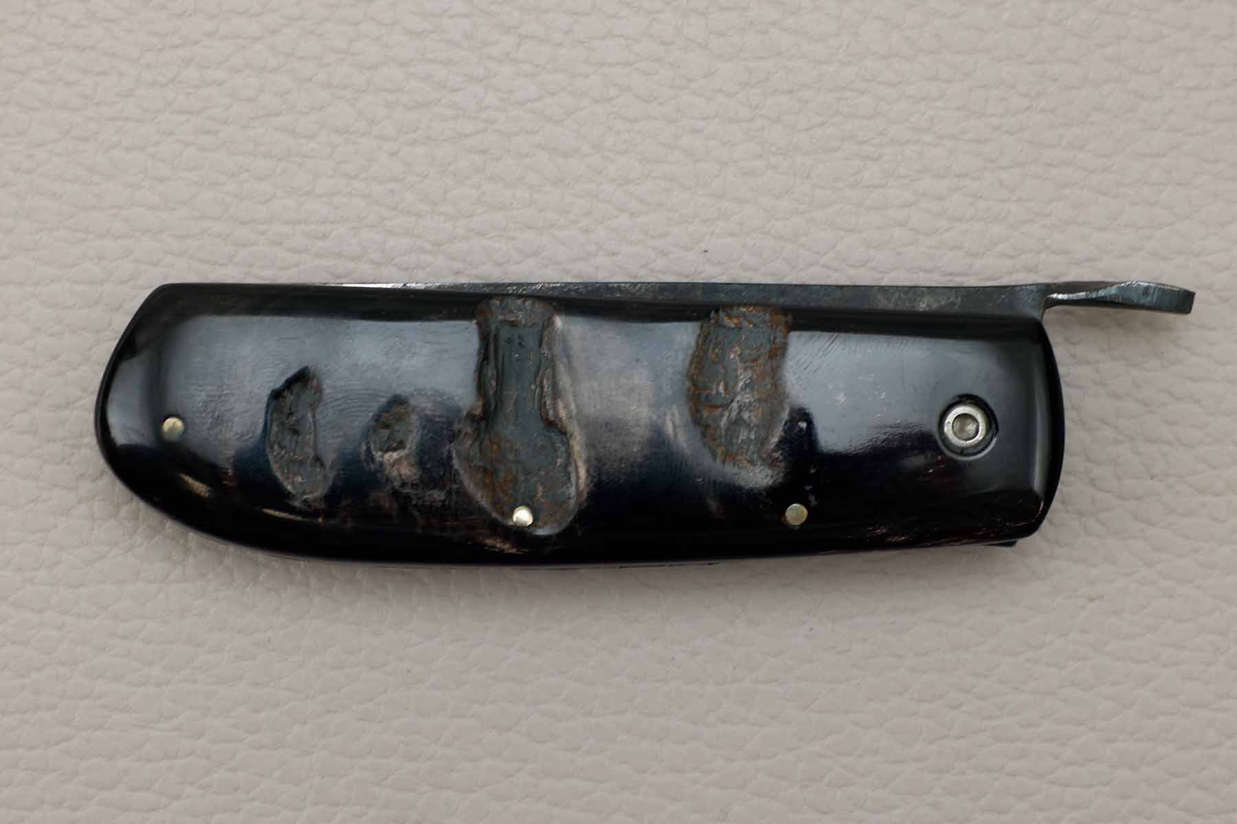 Manche en corne de buffle avec entretoise guillochée fixé avec trois rivets maillechort.