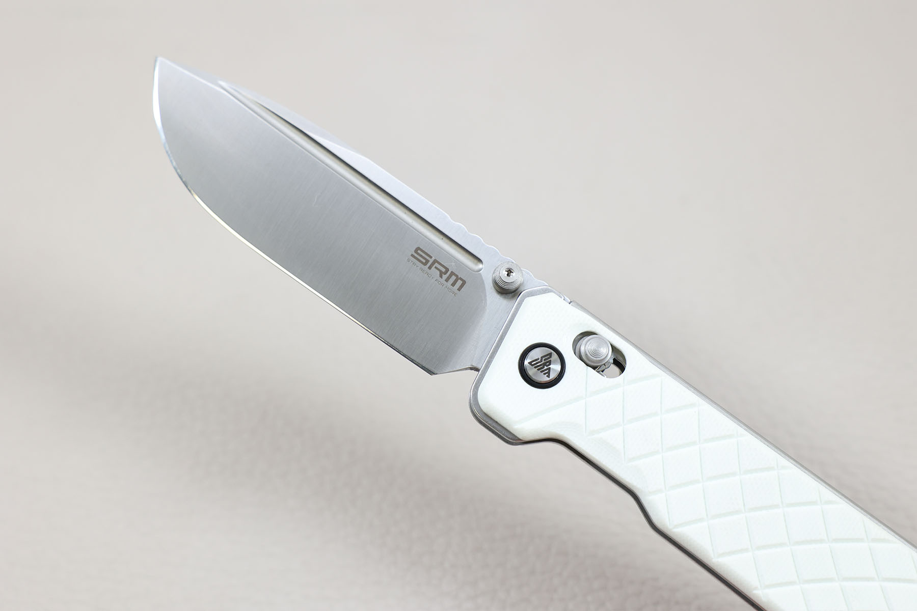Couteau de poche SRM muni d'une lame en acier 14C28N et d'un manche en G10 blanc texturé.