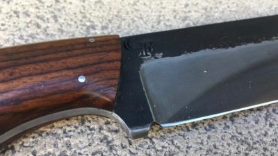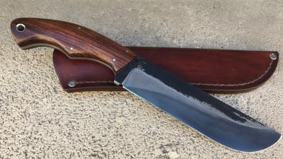 Lame forgée en acier carbone 80CrV2 avec finition "brut de forge" sur le haut de la lame.