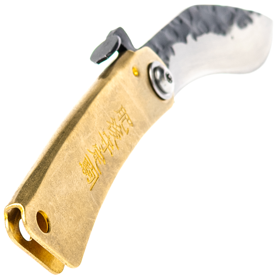Ce couteau est muni d'une lame en acier 3Cr13Mov, finition brut de forge martelé, montée sur un manche en laiton.
