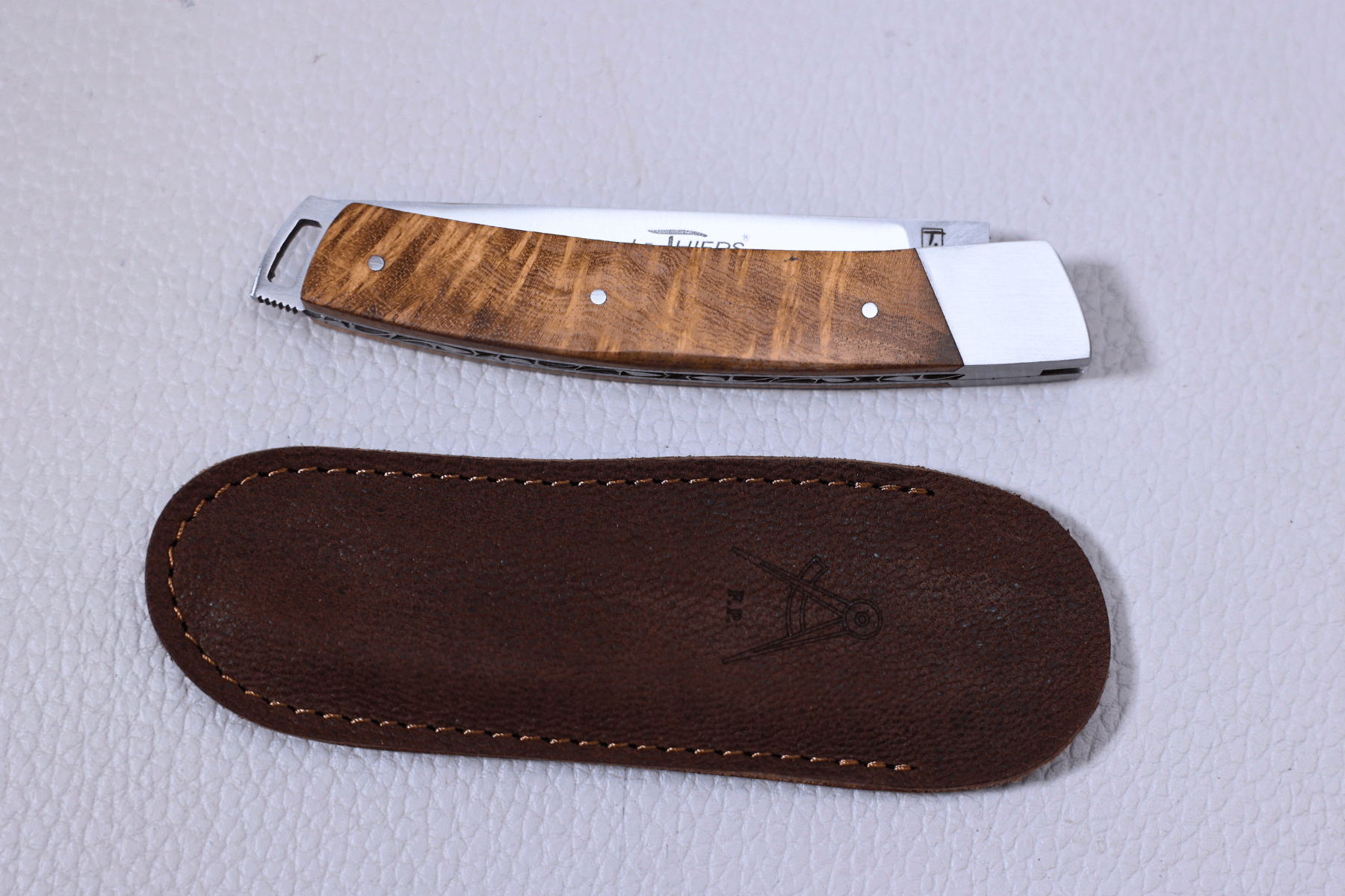 Le couteau Le Thiers Nature est livré avec un étui en cuir brun