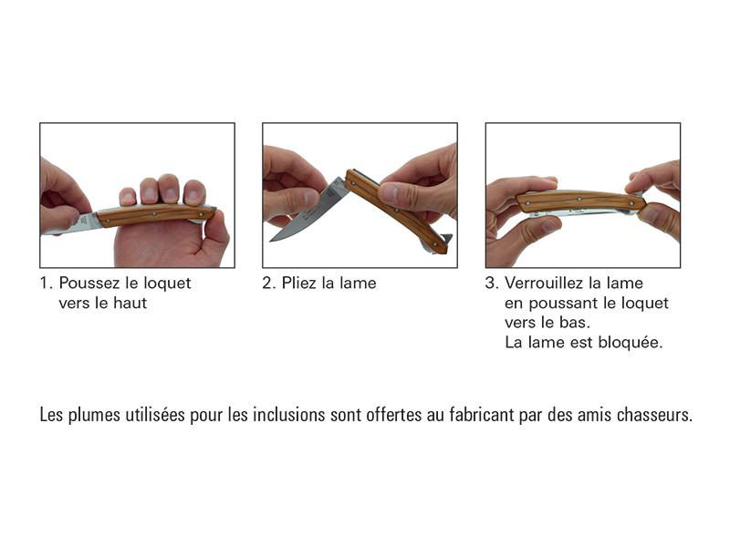 Lame acier X50CrMoV15 brillante (le blocage s'effectue grâce à un loquet de verrouillage situé en bout de manche)