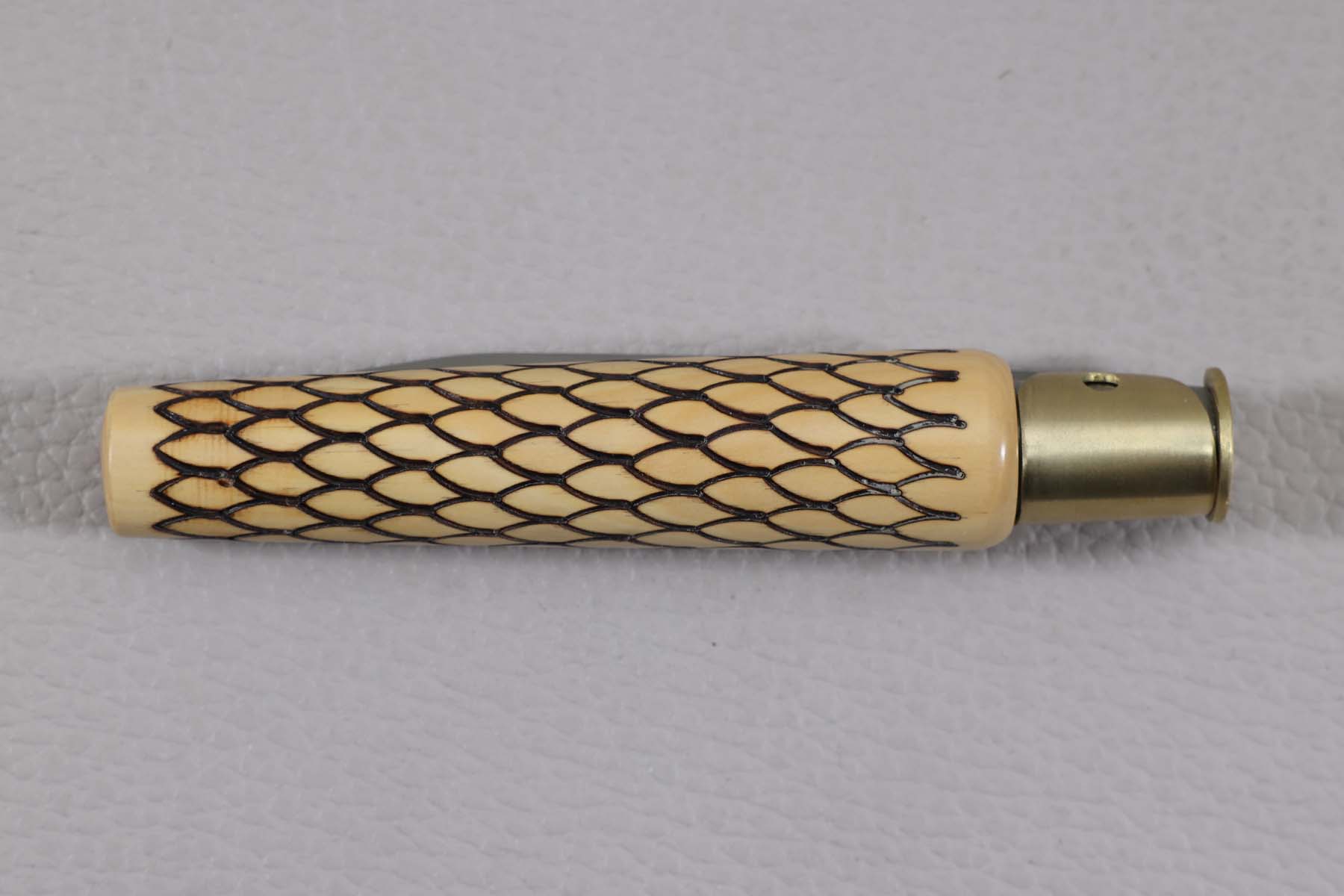 Le manche est en buis pyrogravé plumes et muni d'une virole bloquante.