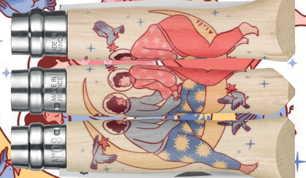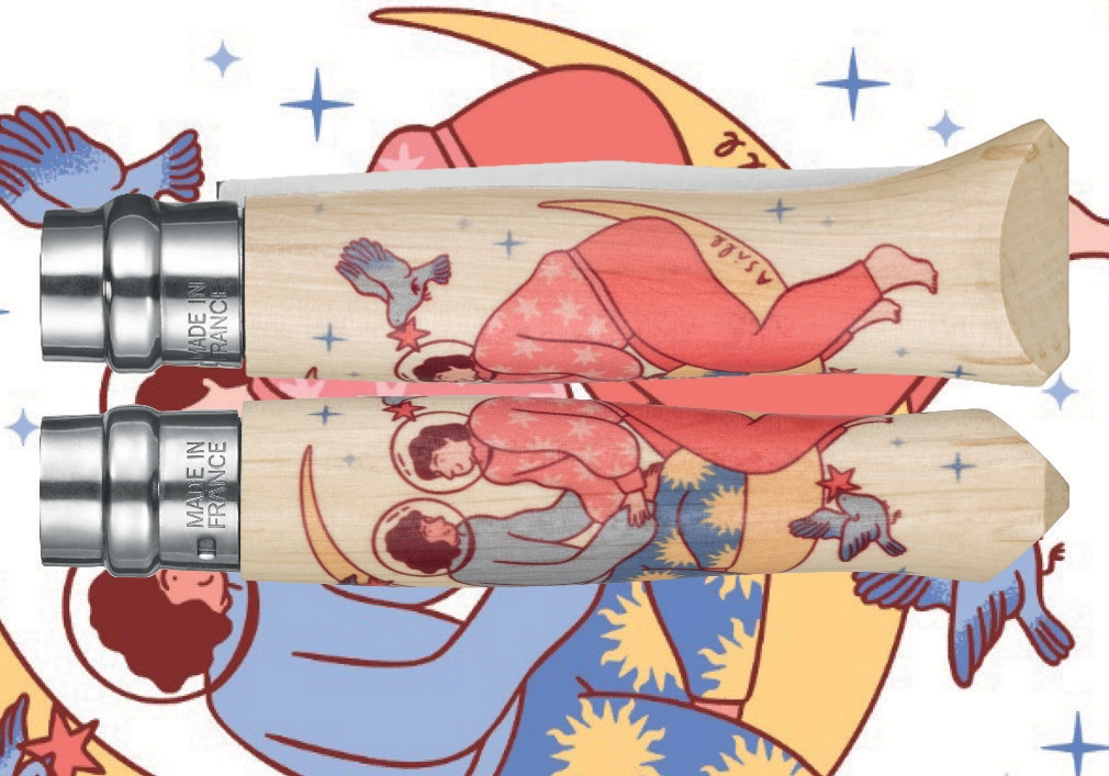 Opinel poursuit son aventure artistique en invitant trois artistes engagés pour une collaboration sur le célèbre couteau de poche Opinel n°8. Chaque artiste nous apporte sa vision du cosmos en sublimant le manche du couteau pliant.