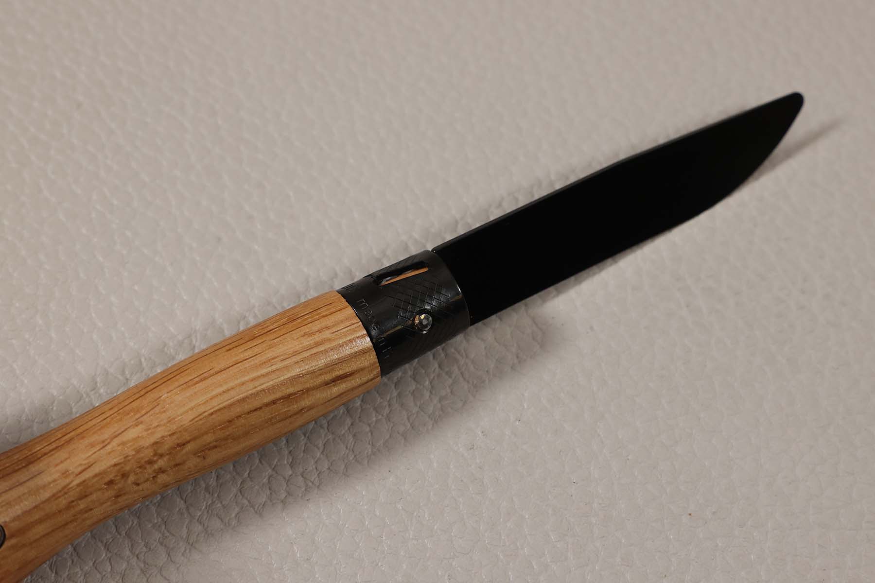 Son manche en chêne, monté d'une lame en acier inoxydable, finition PVD noire de 7 cm au bout arrondi.