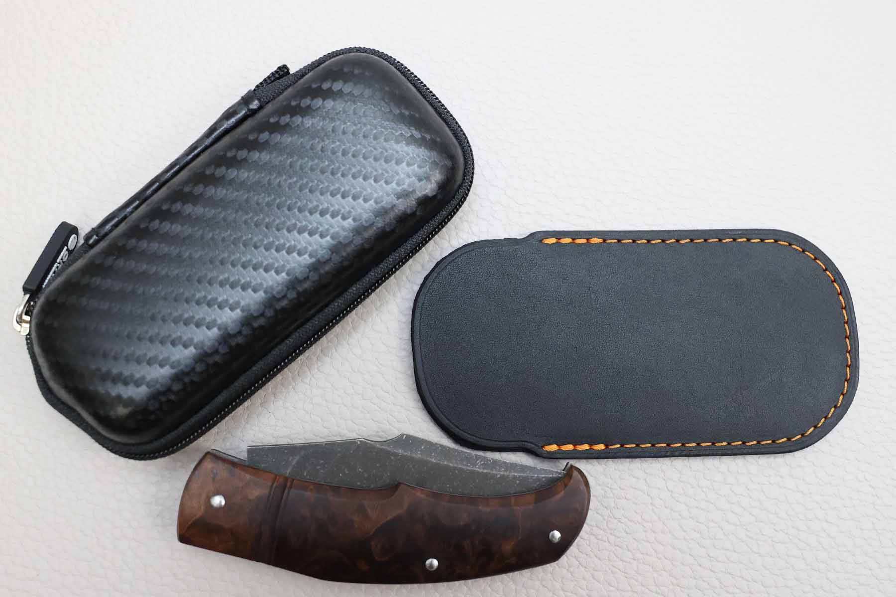 Couteau vendu avec un étui cuir et une pochette de protection.