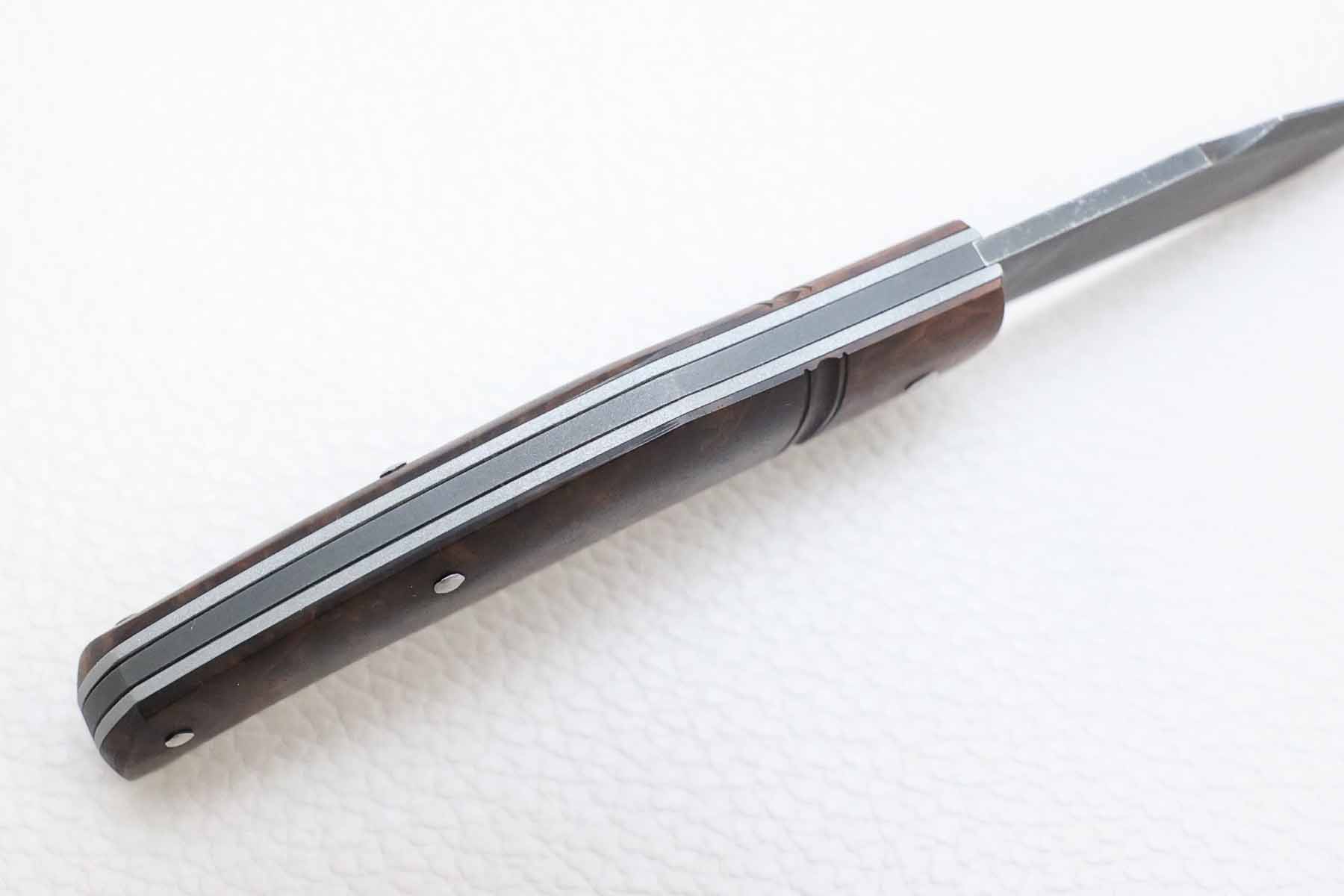 Plaquettes en noyer stabilisés montées sur platines en acier Z20C13 sablées.
