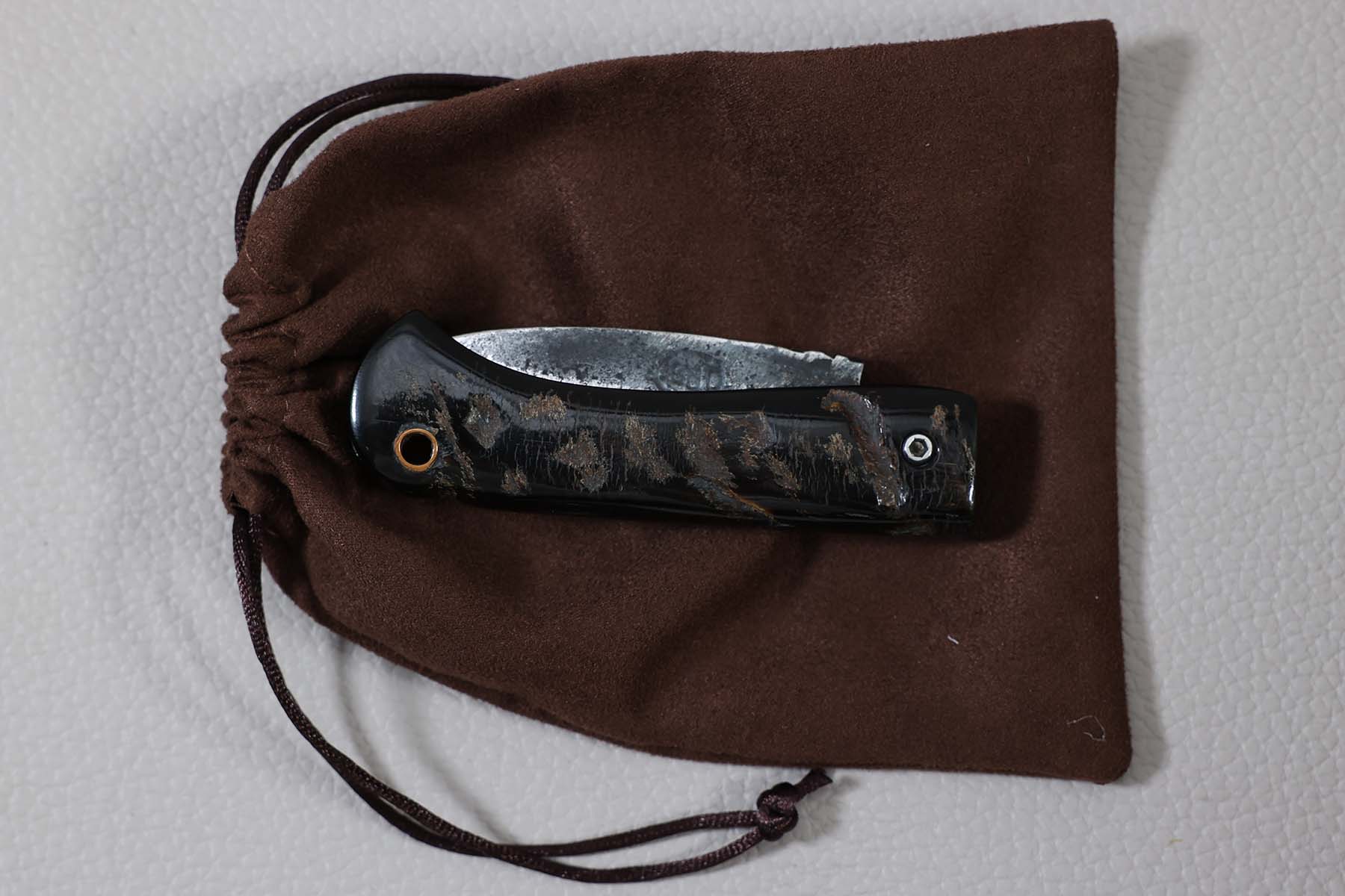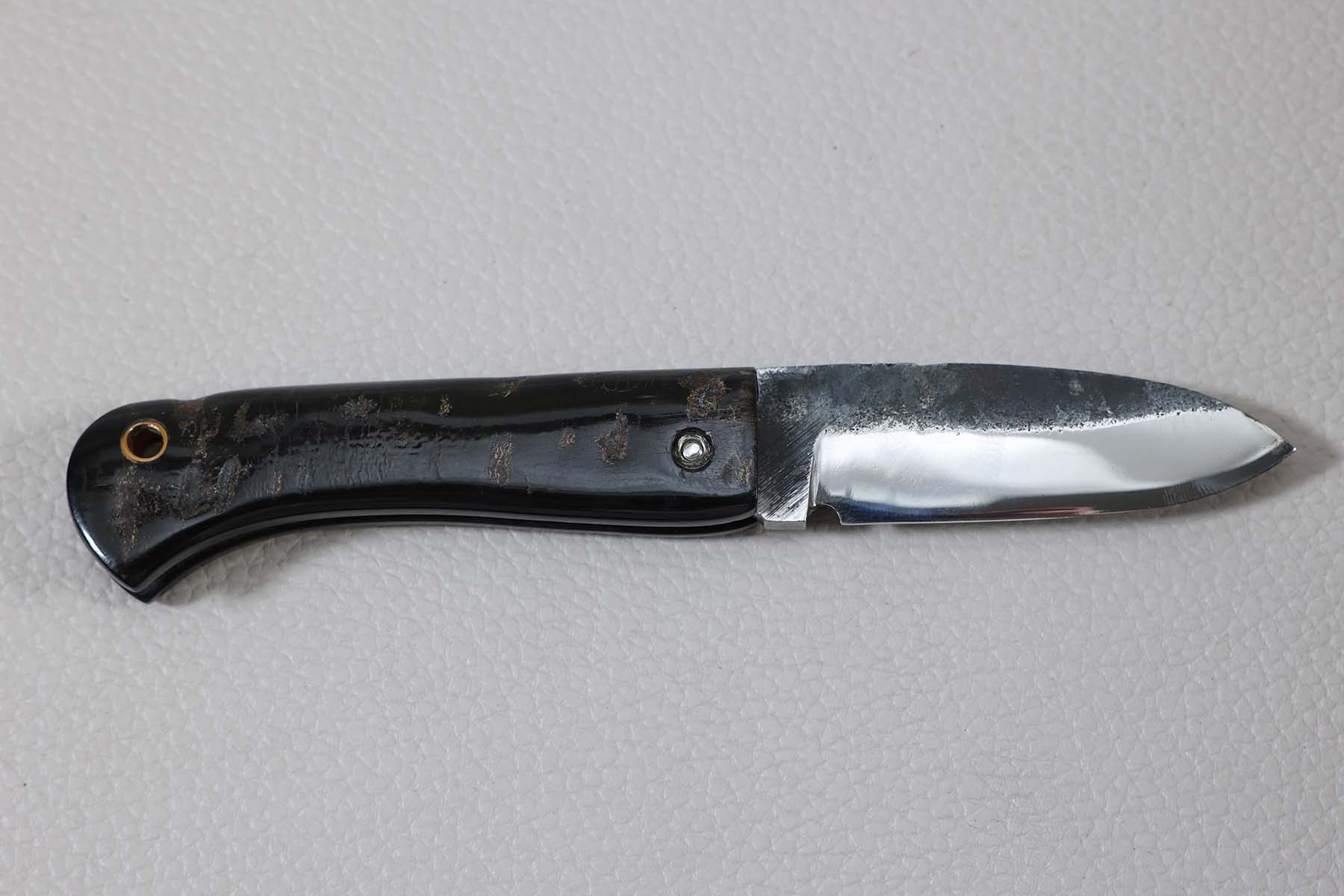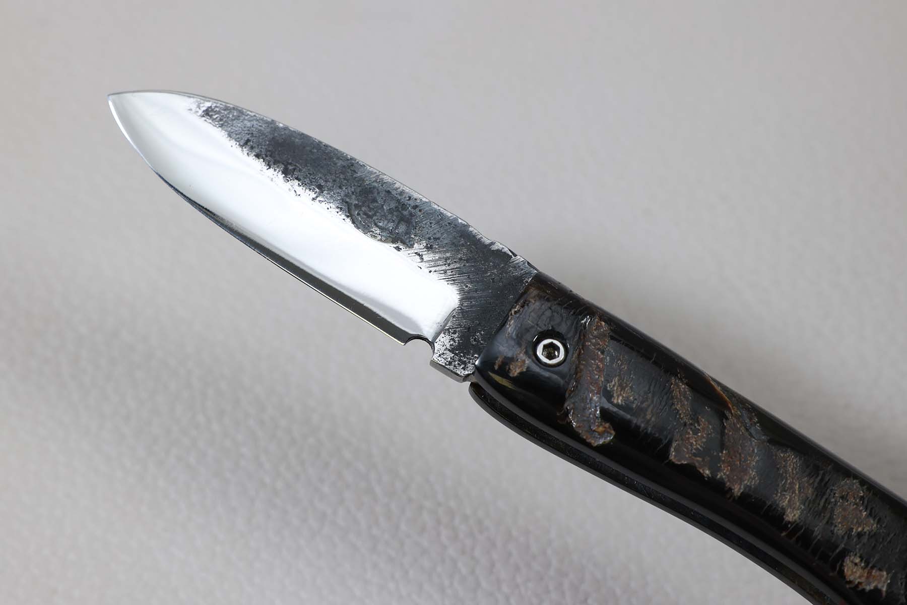 Lame acier XC75 brut de forge, forgée main avec ligne de trempe différentielle apparente et dos partiellement guilloché.