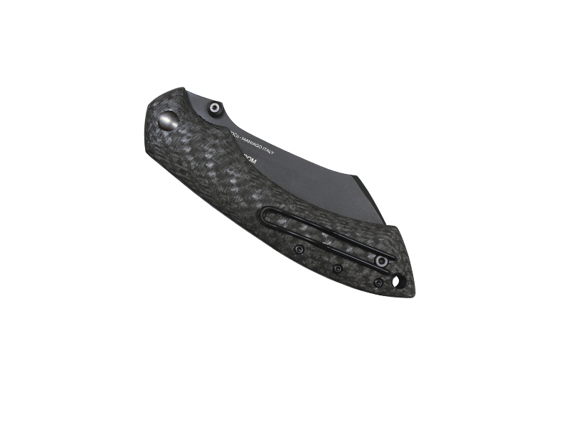 Lame acier N690Co revêtement Cerakote® noire à cran intérieur et bouton double, Manche 12,5 cm fibre de carbone noir,
