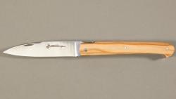 Couteau muni d'une lame de 7.5 cm en acier inoxydable 12C27 et d'un manche de 9 cm doté de plaquettes en olivier.