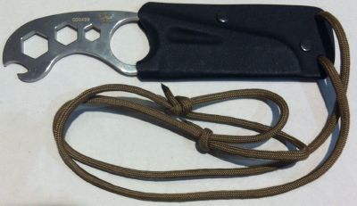 Ce couteau peut servir de clé pour des boulons de trois tailles différentes, comporte un démanilleur ainsi qu'un décapsuleur.