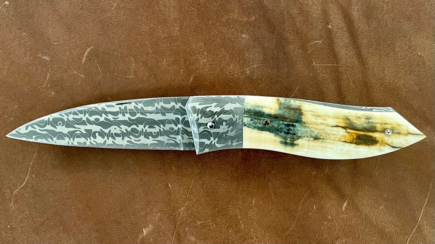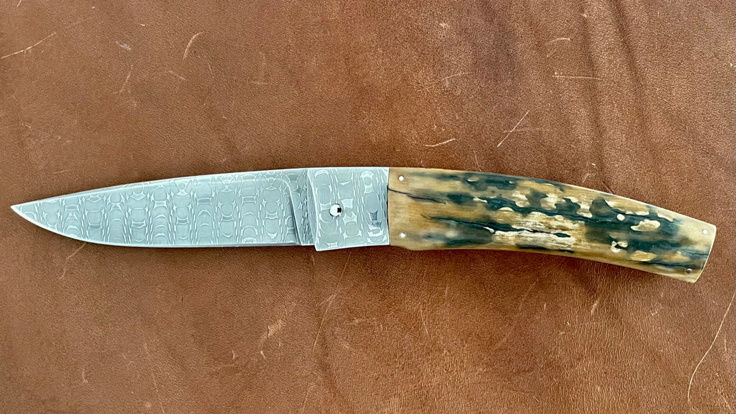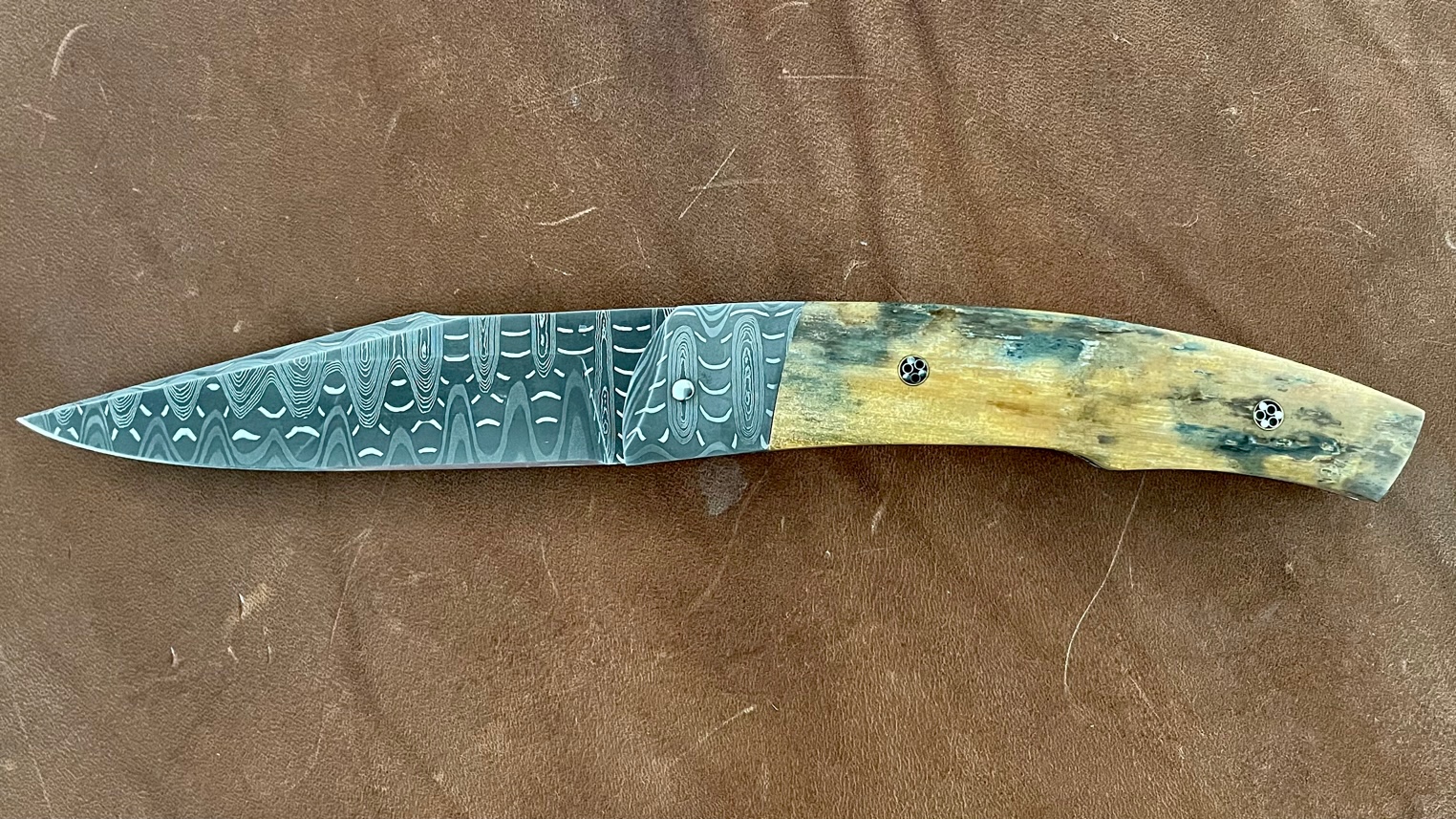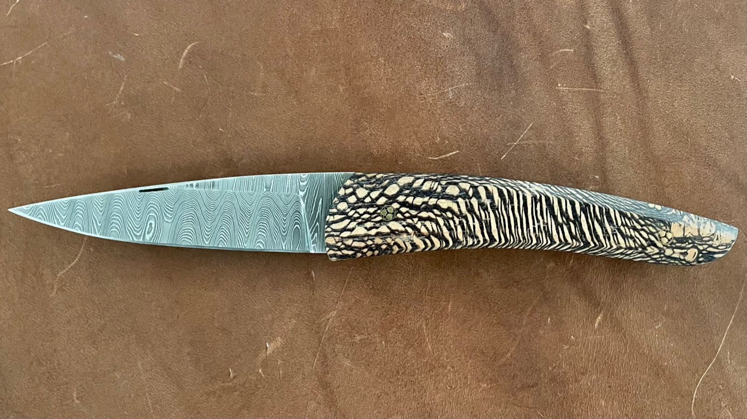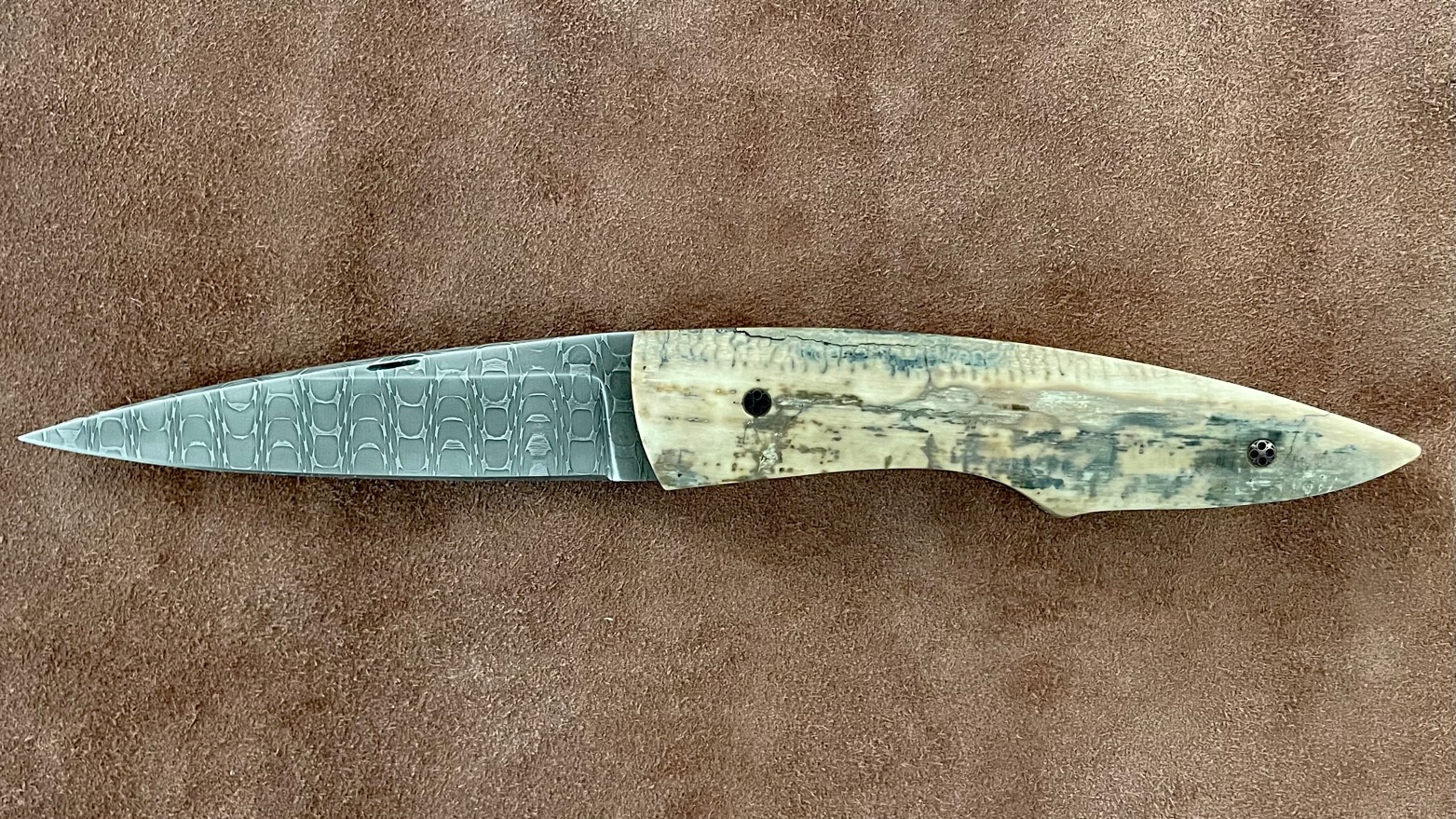 Couteau artisanal de Alain et Joris Chomilier damas Vegas et mammouthCouteau pliant artisanal de Alain & Joris Chomilier.