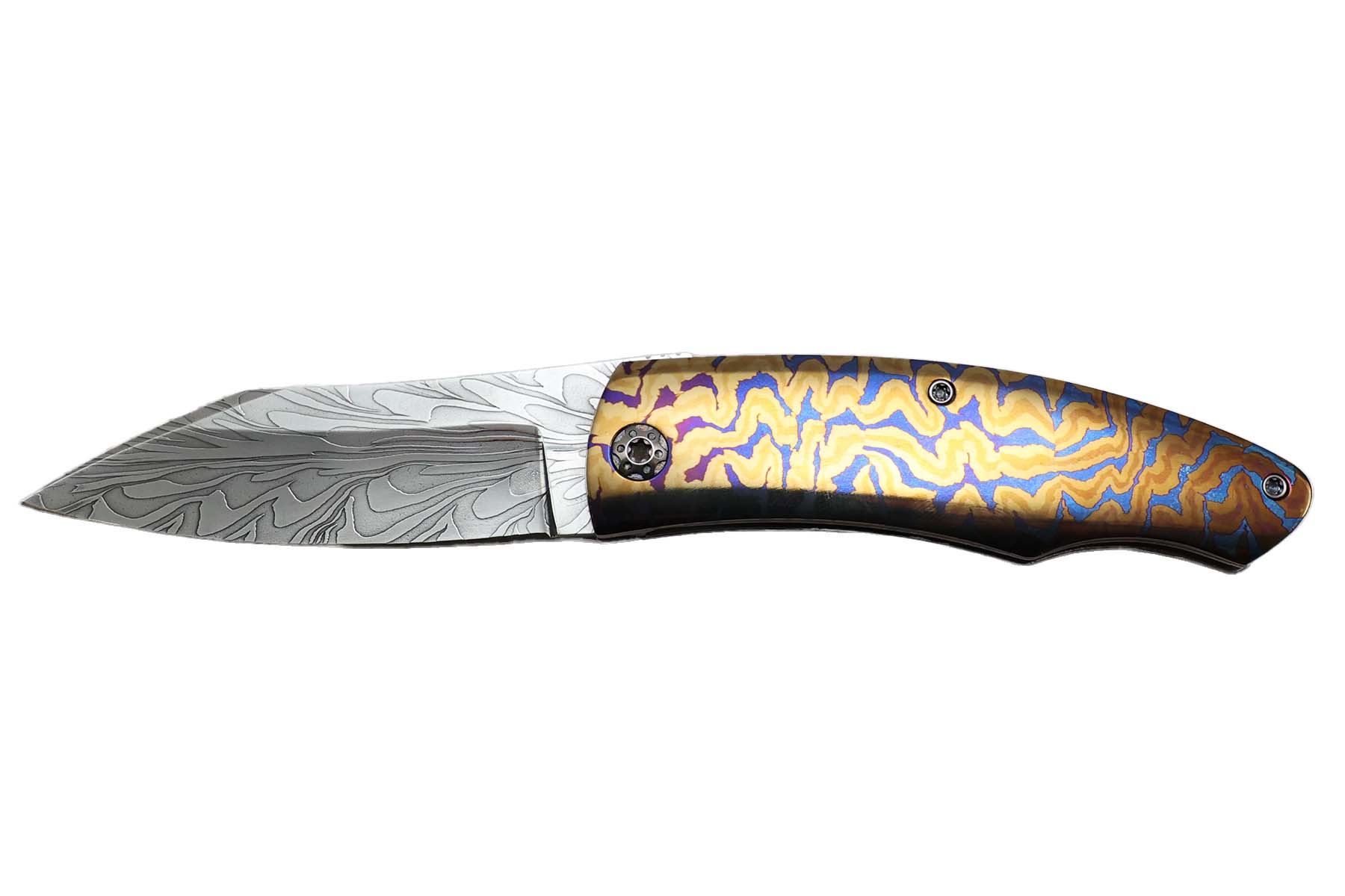 Couteau artisanal de Alain et Joris Chomilier damas et TimascusCouteau pliant artisanal de Alain & Joris Chomilier.
