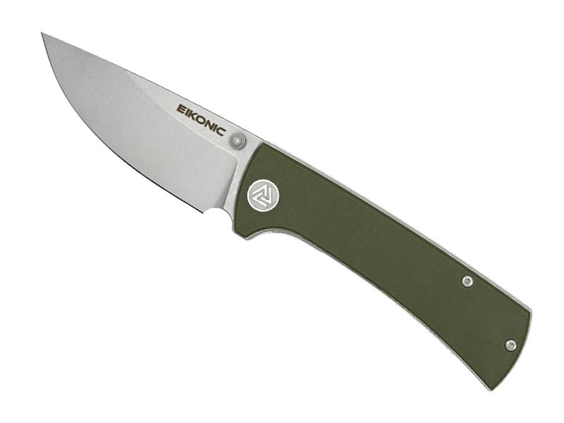 Couteau pliant Eikonic Dromas - Lame acier finition stonewashed - Manche 11,5 cm micarta vert - Design : Brian Brown.