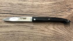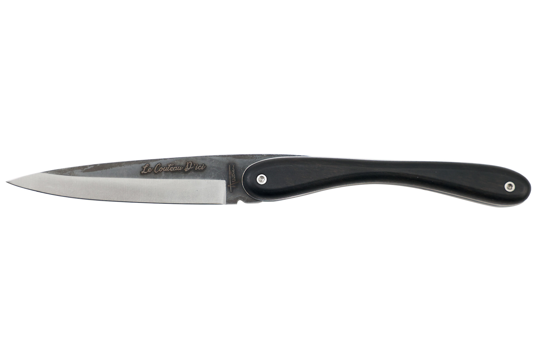Couteau muni d'une lame de 7.5 cm en acier inoxydable 12C27 et d'un manche de 9 cm doté de plaquettes en ébène.