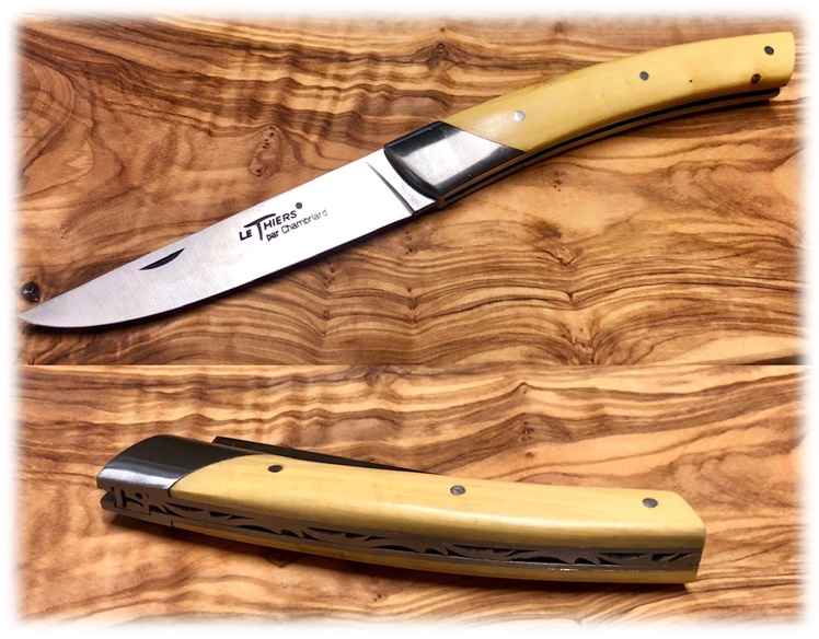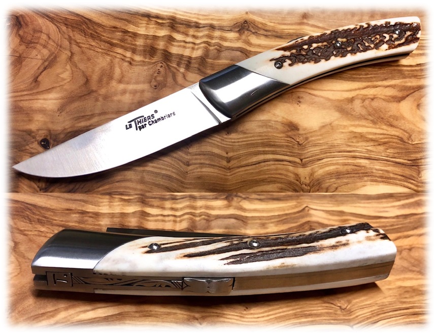 Le couteau ThiersLe Compagnon de la Coutellerie Chambriard située à Thiers est le modèle phare de la marque, la forme Thiers du couteau est munie d'une lame de 9 cm en acier 13C26 et les plaquettes sont réalisées dans de jolis morceaux de bois ou de belles matières comme le bois de cerf ou la corne de bélier.