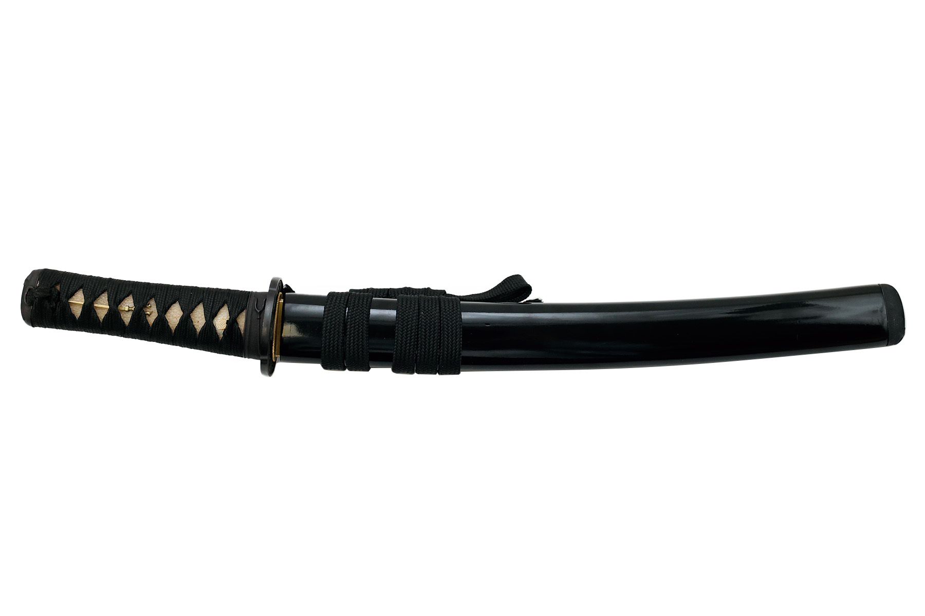Tsuba en acier travaillé, Saya en bois et finition bois laqué noir.