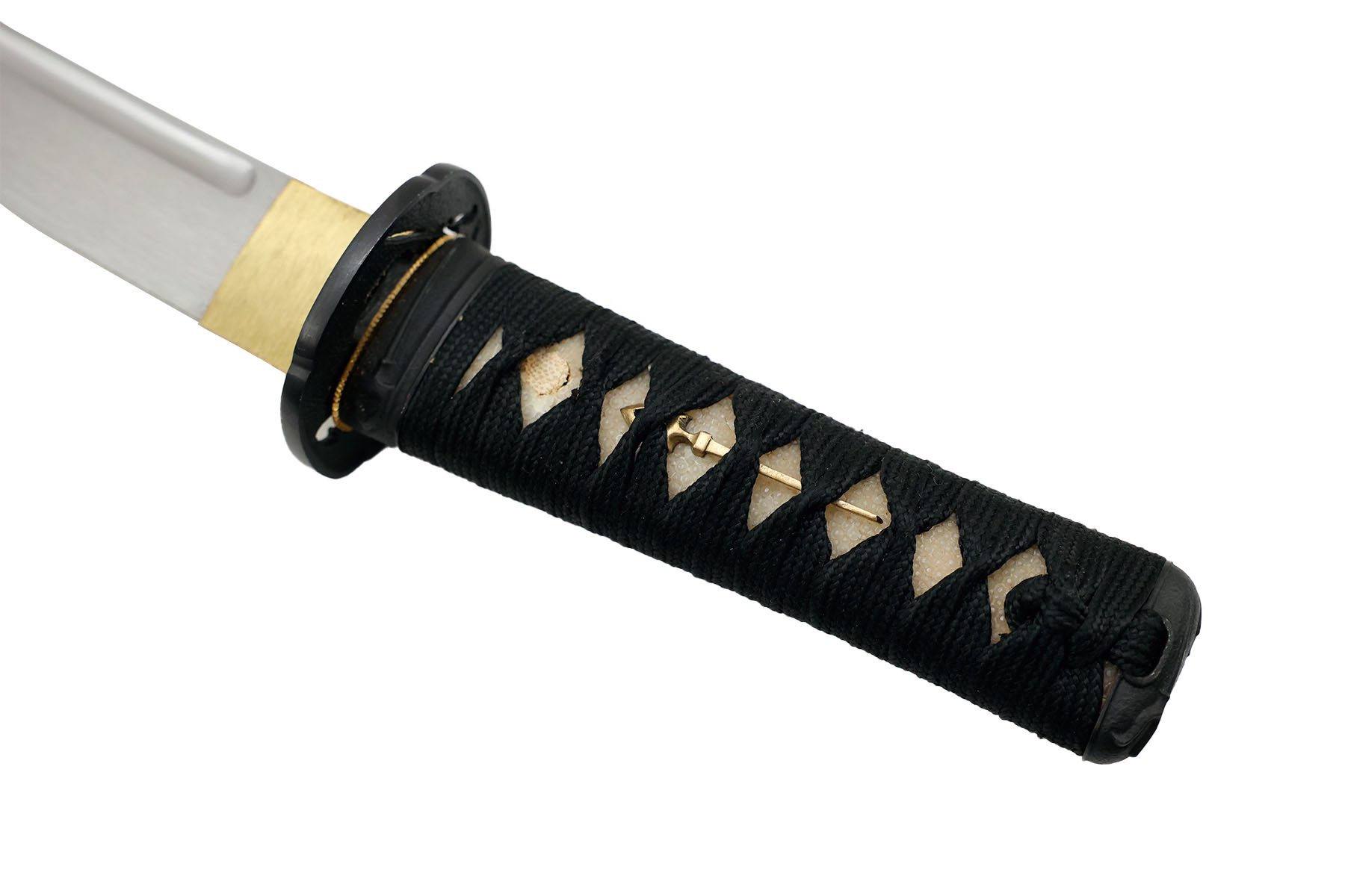 Tsuka en bois, doublé de galuchat (peau de raie) le tout maintenu par un tressage coton noir pour une préhension agréable, Menuki coulé à la cire perdue, le tout entièrement démontable.